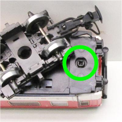 Schrauben unter den Drehgestellen entfernen. Siehe grüner Kreis.